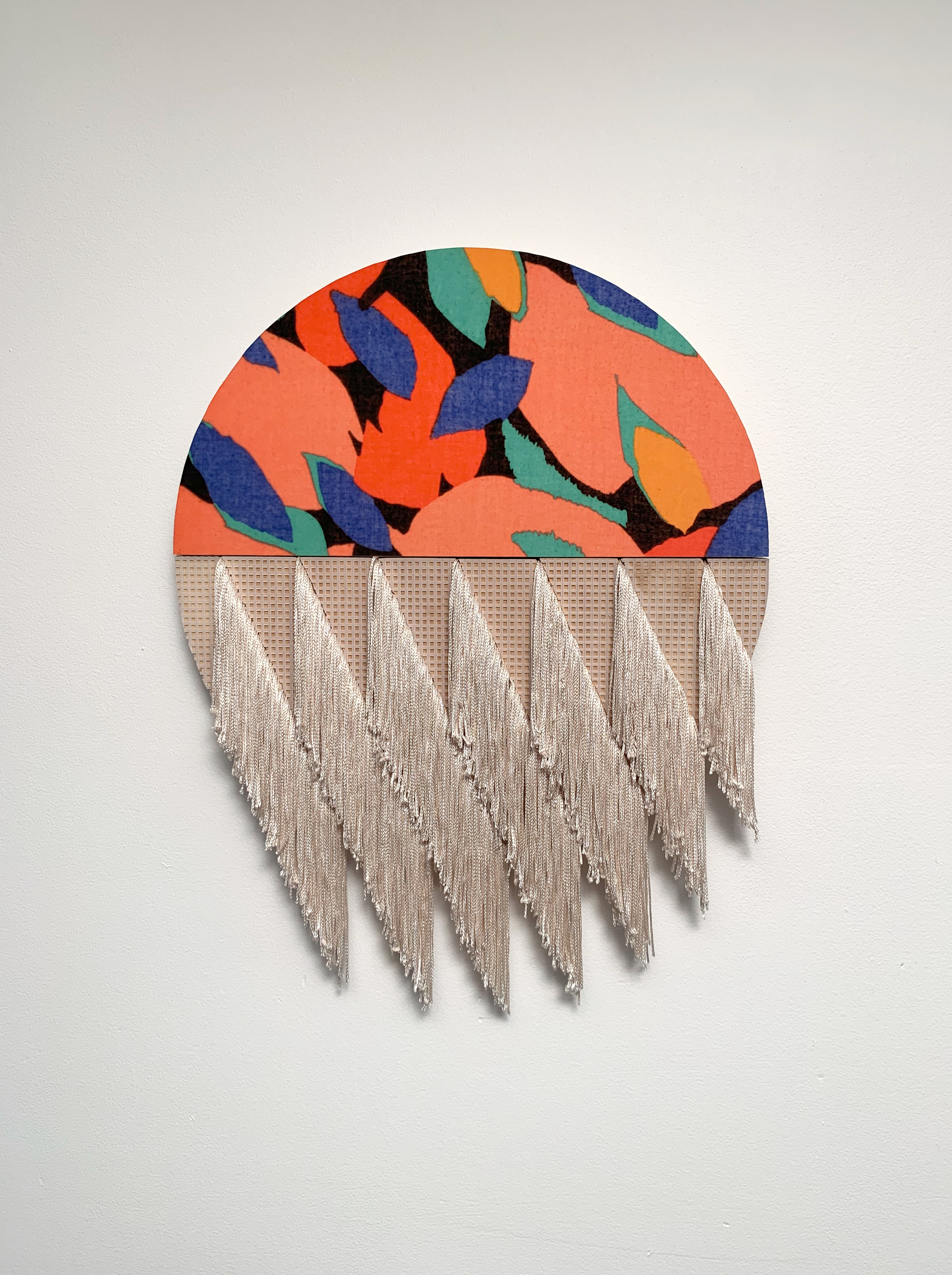 , 2018, inkjet print, plastic grid, fringe and plywood