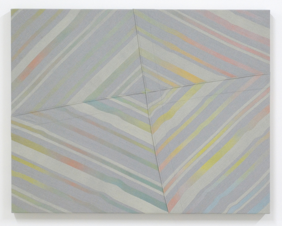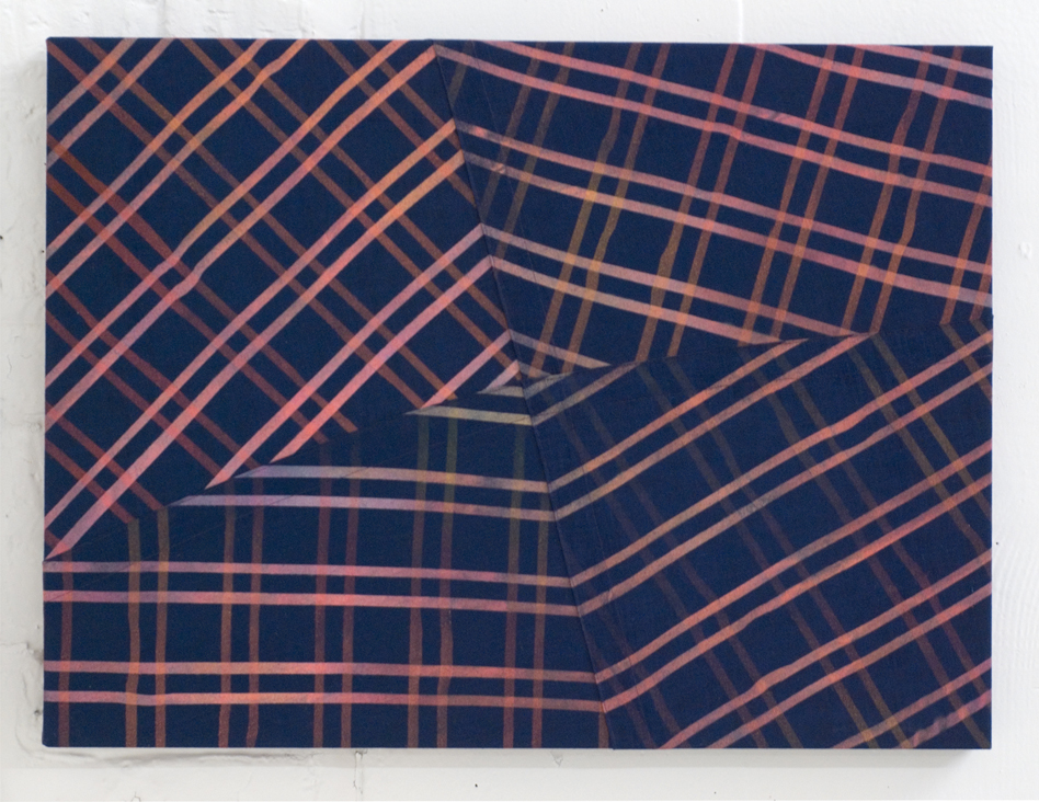 Tape and spray paint are used to recreate the patterns found on the inseams of pants, exploring the way the patterns come together at the seams and how they translate from the body to the stretched canvas.